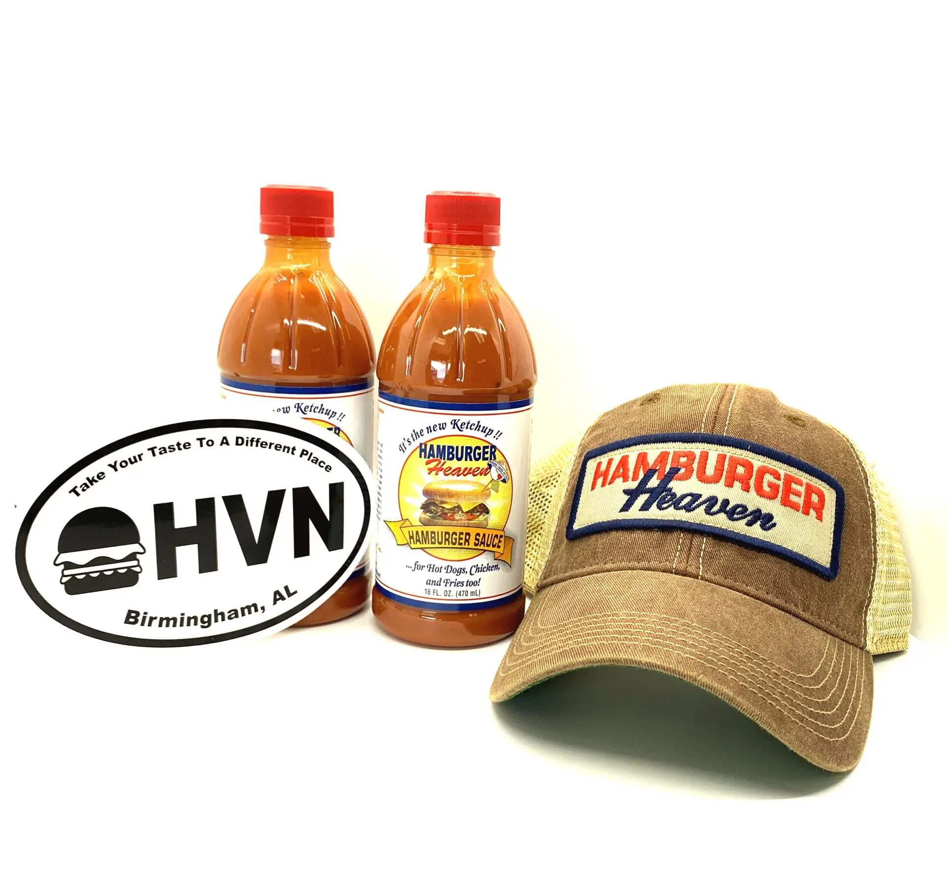 Legacy 92 Trucker Hat (Brown, Camo, or Blue), Hamburger Heaven Sticker and 2-Bottles of Hamburger Heaven Sauce.